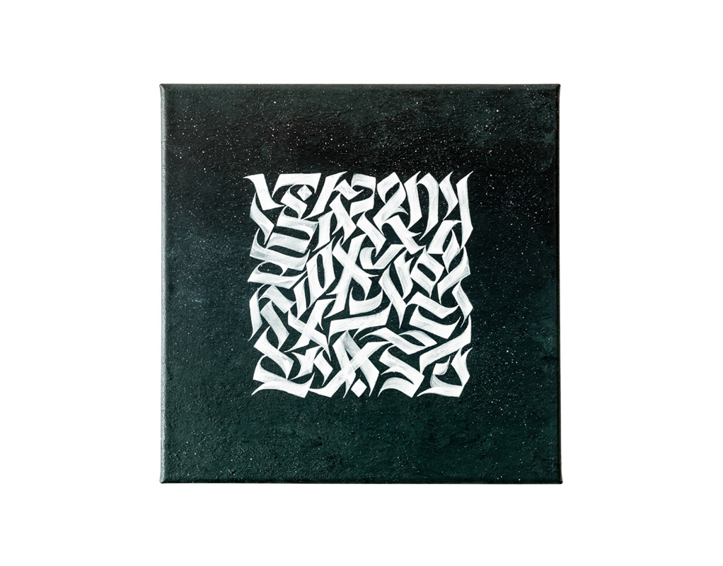 冬の夜空という美しくも冷たい背景に、タイトル名をカリグラフィティで表現しました。
